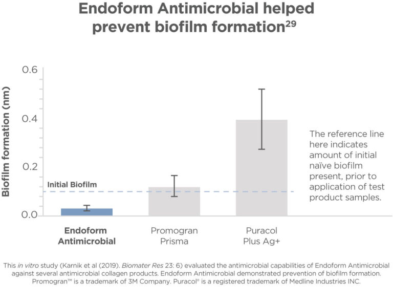 - Combining Endoform Antimicrobial with debridement prevents biofilm formation29