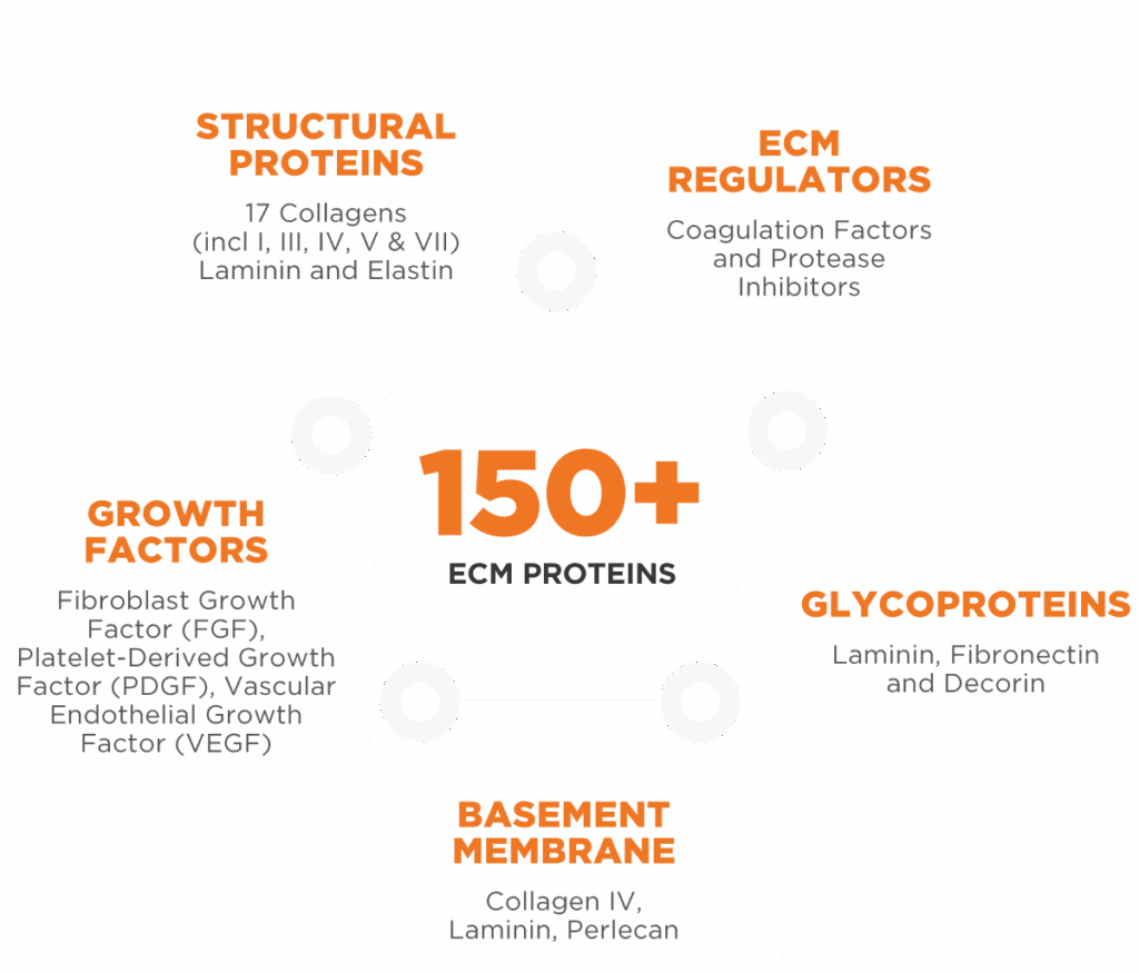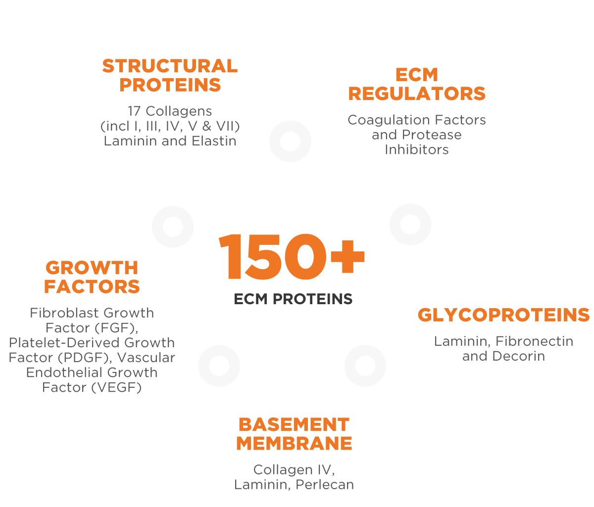 - Contains >150 ECM proteins including growth factors, signaling and anti-inflammatory proteins9